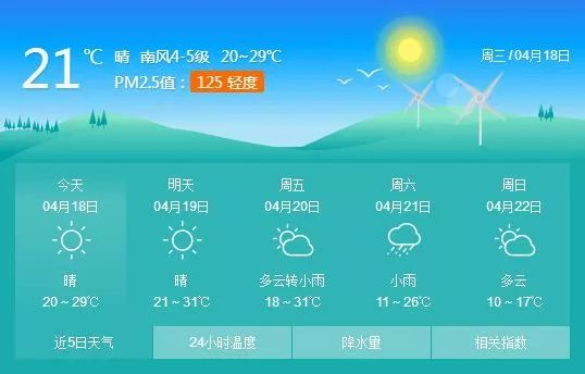 市 区 晴 南风4~5级阵风7~8级 气温20℃~31℃