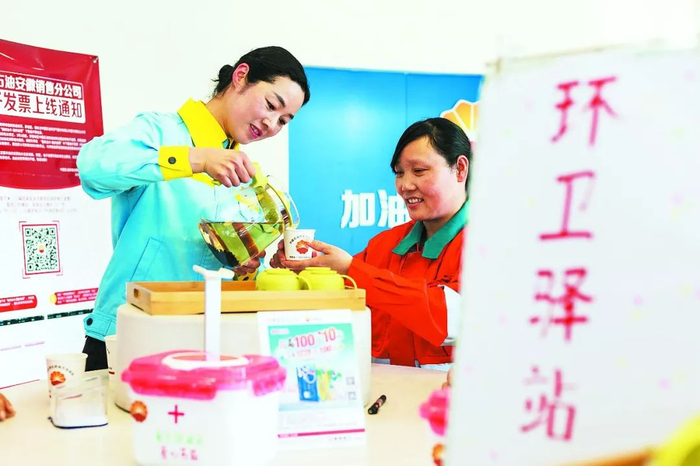 2017年,中国石油安徽合肥销售分公司组织了“为爱加油,每一座站都是一个家”爱心接力活动,利用加油站网点多、布局广、设施全等有利条件,在市区设置了40多座“环卫工人爱心驿站”,全年24小时不间断为环卫工人提供开水、帮助热饭、手机充电、临时休息、卫生间等免费服务,以实际行动传播正能量。