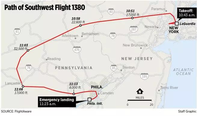 当时这架载有143名乘客和五名机组人员的737-700飞机正从达拉斯飞往纽约,在位于费城上空32000英尺高度时,飞机一个引擎突然发生爆炸,引擎碎片击碎了客舱的一个窗户玻璃,导致坐在窗户旁边的一名妇女半个身体被吸出了窗外。头部受重伤。
