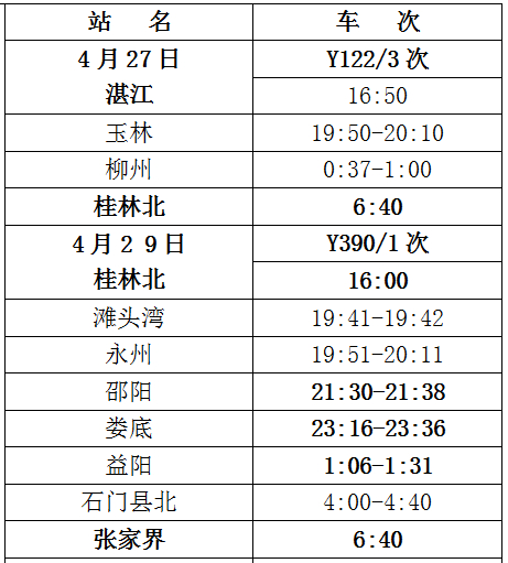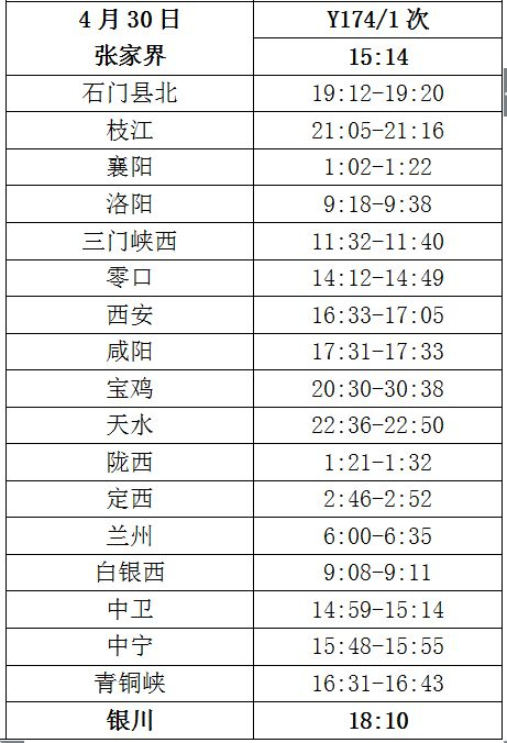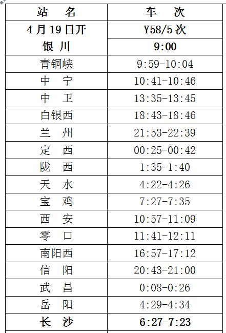 Y58/5次列车4月19日9时银川始发,经青铜峡、中卫、中卫、定西、宝鸡、西安、信阳、武昌、岳阳等15个到站,于21日6时27分抵达长沙,乘车旅客将会拥有18小时11分领略古潭州的大美风光;Y124/1次列车22日0时38分长沙始发,经株洲、衡阳、郴州、韶关东、广州东等站,于当日11时50分抵达广州;