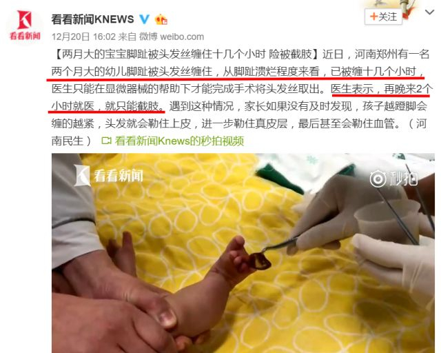 去年12月,河南郑州一2个月大的宝宝脚趾被头发丝缠住,十几个小时才被家人发现。送医时,脚趾已经肿得发黑……医生说,再晚一点送来,就要截掉这段脚趾头了。