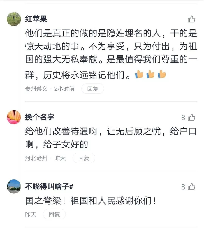 他们是国之重器,民族的脊梁。他们的精神,在当今浮躁喧嚣的社会是弥足珍贵的。支持中国科技,尊重我国的科技人才!