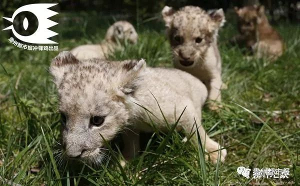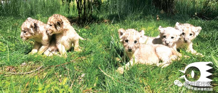 4月17日,阳光明媚,贵州森林野生动物园珍稀动物区育幼室外草坪上,5只刚可以吃些糜食的小非洲狮正享受着日光浴。40天前,一只7岁的非洲狮产下6胞胎,一胎6崽在“狮界”极为罕见。
