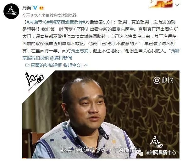 官方密集表态的同时,媒体的跟进报道也全面爆发。《新京报》《局面》栏目的“我们视频”于17日16时59分至18日12时43分,连发14条采访视频,以“鸿茅药酒案反转”“对话谭秦东”为话题,采访谭秦东及其妻子和代理律师胡定锋。谭秦东妻子采访时表示,凉城县警方曾向他们推荐一王姓律师,该律师疑似曾以威逼利诱方式迫使谭秦东认罪。胡定锋律师则质疑鸿茅药酒退货证据不充分、警方笔录不完整等细节问题。在谭秦东的采访中,“想哭,自由真好”“不后悔,想做个好医生”等言论被媒体转载。