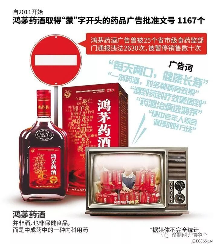 鸿茅药酒大面积投放广告涉嫌虚假宣传的行为在业界广受吐槽,每年150多亿元的广告投入引发公众质疑“神药还是神广告”。据《健康时报》2017年8月份的文章《2630次广告违法不止,谁是鸿茅药酒的护身符?》显示,过去10年间,据不完全统计,鸿茅药酒广告曾被江苏、辽宁、山西、湖北等25个省市级食药监部门通报违法,违法次数达2630次,被暂停销售数十次。媒体评论中多引用这一数据,质疑“药监部门为何对鸿茅药酒违法选择性失明”。