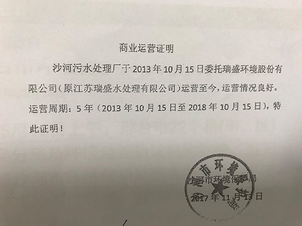 张砚提供的复印件显示,瑞盛环境提供了河北沙河市污水处理厂第三方运营项目中标公示及中标通知书、沙河市财政支付银行记录、沙河市环保局向当地财政局申请拨付污水处理费的文件,还有一份沙河市环保局对瑞盛环境运营情况良好的证明。