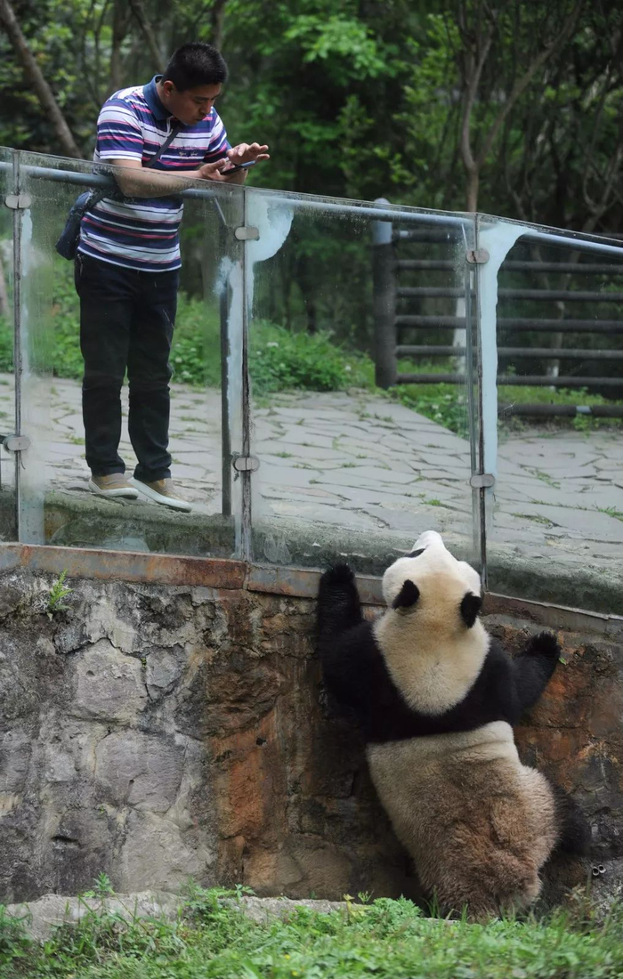 突然,“阿杰”直起身板,将两只前掌搭在玻璃护栏上,还拼命用力往上蹬。这突如其来的举动把毫无防备,凑在玻璃护栏前拍照的游客吓了一大跳。