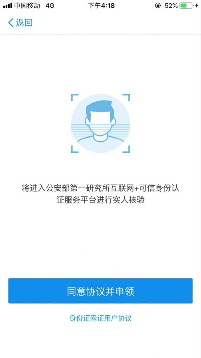 第四步:再次点击之后,界面进入人脸识别系统。系统提示,“将进入公安部第一研究所互联网+可信身份认证服务平台进行实人核验”,点击下方蓝色条块的“同意协议并申领”后,进入到人脸识别界面。