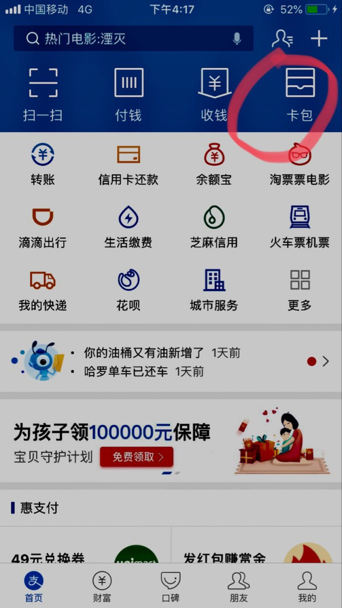 第一步:4月19日中午,身为济南户籍居民的记者,登录手机支付宝客户端后,点击了右上角的卡包模块。
