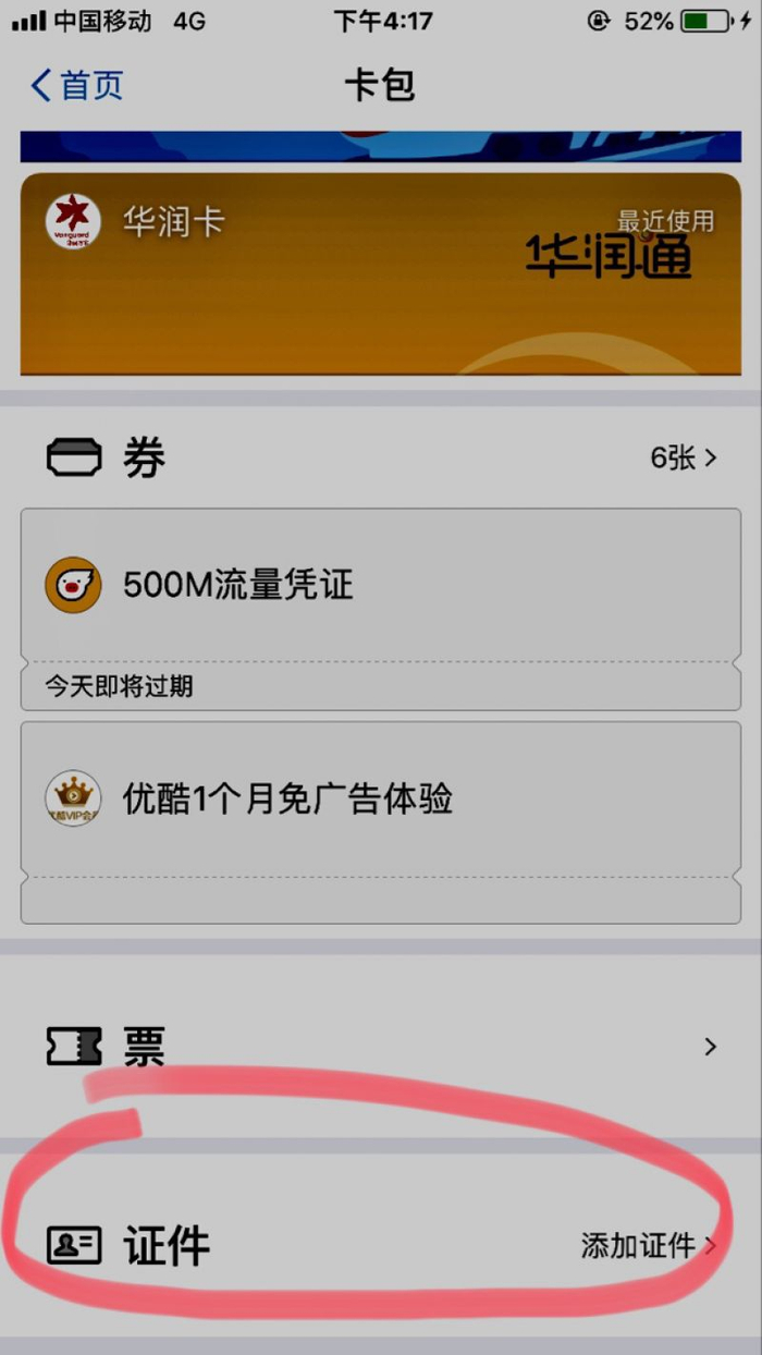 第二步:进入操作界面后,点击最下面的证件栏,进入到了电子证件领取的操作场景。