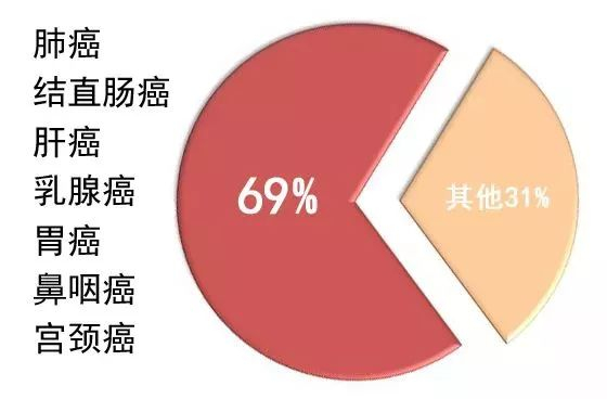 女性恶性肿瘤导致的死亡,则以肺癌、结直肠癌、肝癌、乳腺癌、胃癌、鼻咽癌、宫颈癌为主,合计约占女性全部恶性肿瘤死亡的69%。