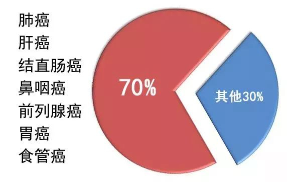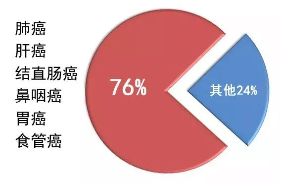 男性恶性肿瘤导致的死亡则以肺癌、肝癌、结直肠癌、鼻咽癌、胃癌、食管癌为主,合计约占男性全部恶性肿瘤死亡的76%。