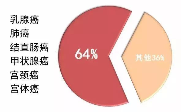 常见的新发恶性肿瘤为乳腺癌、肺癌、结直肠癌、甲状腺癌、宫颈癌及宫体癌,合计约占女性全部新发恶性肿瘤的64%。