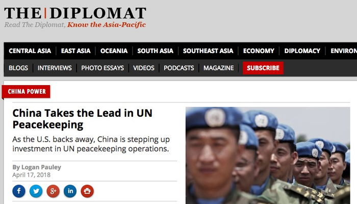 例如,在维和领域,美国外交学者网站于4月17日刊登一篇题为《中国已成为联合国维和行动领导者》的文章称,过去5年来,中国大幅增加了对联合国维和任务的资金投入,训练了8000名解放军官兵作为联合国维和待命部队。BBC报道称,在73亿美元的维和费用中,中国出资位列第二,大约负担10%。