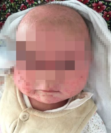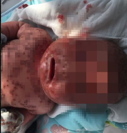 “孩子3个月大,送来时全身都呈红色、暗红色的糜烂性疱疹、痂疹,尤其是头部格外严重,脸上几乎密密麻麻都是疱疹,可以说是体无完肤,惨不忍睹。”朱海峤说,孩子虽然时有哭闹,但精神状态比较差,病情比较危重。据患儿家属叙述,孩子发烧已经多天了,全身皮疹越来越严重,在当地医院就诊后,由于病情太重,原因不明,医生建议立即转院。
