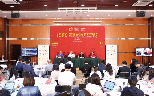 在选手们专注赛场的同时,总决赛新闻发布会也在有条不紊地进行。19日中午,Bill Poucher、Jeff Donahoo、高松、李文新与来自方正集团、JetBrains、TWO Sigma、商汤科技、快手科技、Hulu、塞帕思、明略数据、启元世界、Recruit Holdings、MIXLABS等赞助企业的嘉宾共同参与了新闻发布会,在邱德拔体育馆138新闻发布厅接受了新华社、塔斯社、中国日报等三十余家海内外媒体的采访。记者就北大计算机教育状况、ACM赛事题目、评判标准等问题进行提问,Bill Poucher、Jeff Donahoo、高松、李文新进行了详尽的解答。