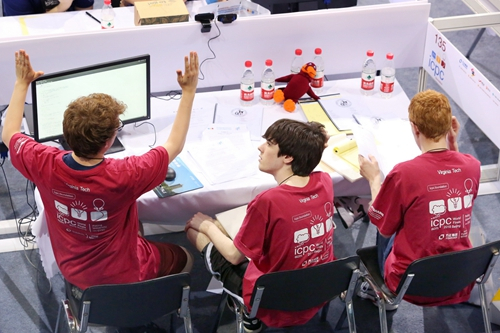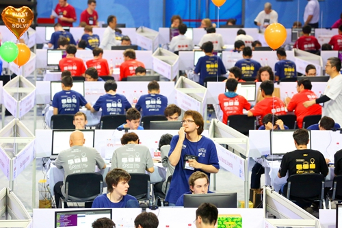 开场13分钟后,来自俄罗斯的超强队伍、“六冠王”圣光机大学(St. Petersburg ITMO University)成功提交F题,成为了本届ACM-ICPC总决赛第一所解题成功的高校。题目解出后,气球作为比赛的重要“吉祥物”也开始入场。据了解,作为ACM总决赛的一项传统,气球被用作答出题目的奖励:每队在正确完成一题后,组织者将在其位置上升起一只代表该题颜色的气球;每道题目的第一支正确解决队伍还会额外获得一个“first to solve”的心形气球。争分夺秒的竞争压力和对准确性的高要求也考验着选手们的心理素质。参赛选手们全神贯注,认真仔细阅读竞赛题目,时而专注思考,时而相互交流,体育馆内不断传出敲击键盘的声音,一个个代表胜利的彩色气球不断升起在参赛队的赛台上。