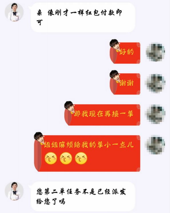 “再扫码给了958元以后,就不能转账了,她把我拉进了一个名为175财务部的微信群。”根据业务员的要求,郭同学在群里发了4个200元和1个158元的红包。“群里有4个人,但是没有人说话,只是收红包。”再完成了任务之后,业务员发来一张兼职结算平台正在结算的图片,说平台正在审核,让郭同学继续做任务。第二个任务,是购买3块价值599元的手表,完成后,郭同学依然没有收到任何佣金和购物资金。
