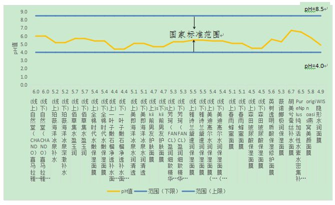 皮肤的pH值呈弱酸性,可抑制皮肤表面细菌繁殖及生长。对于面膜产品,pH值一般要求在4.0-8.5范围内。本次比较试验30款面膜最高pH值为6.7,最低pH值为4.4,均在合格范围内,是安全的。
