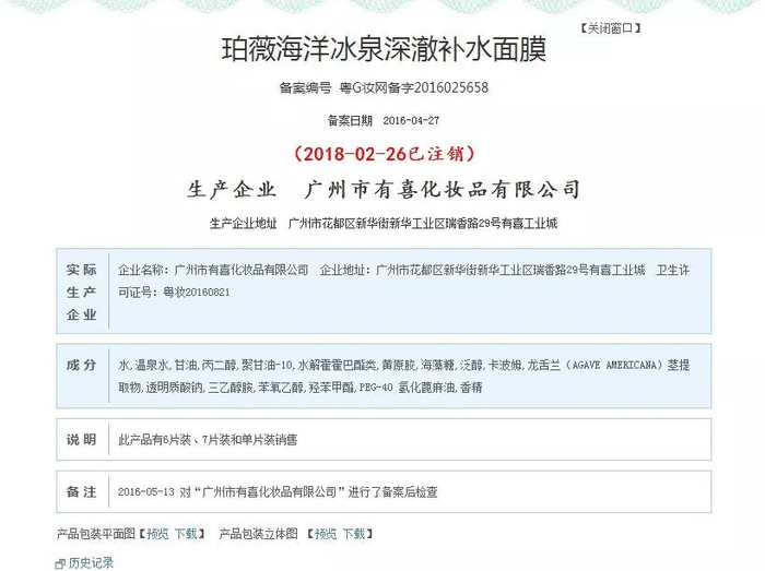 通过查询国家食品药品监督管理总局国产非特殊用途化妆品备案平台,可以看到以上两款产品于2018年2月26日已被注销(见下图),这意味着该两款产品已不能再进行生产。
