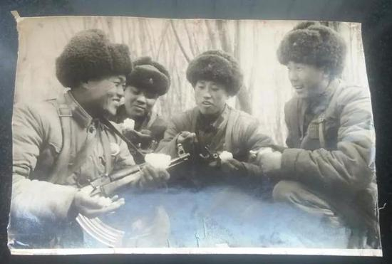 照片里是当时我们在冰天雪地里,用雪块当水喝。