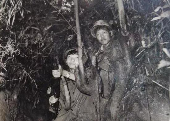 照片是我(右)21岁时和战友在云南老山前线时的情形。