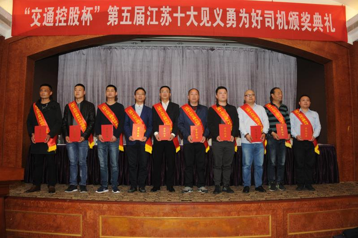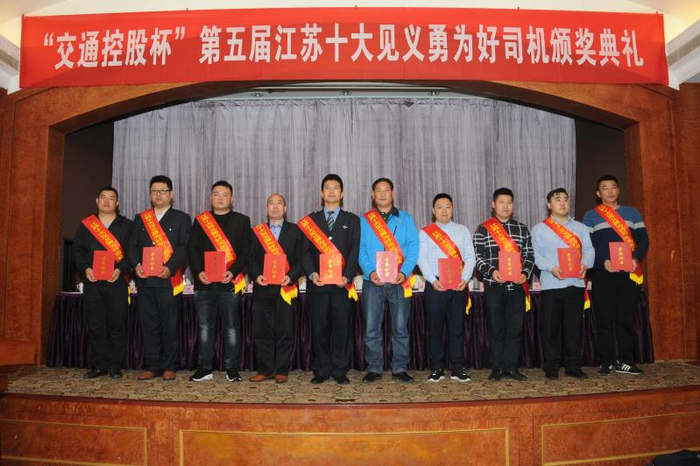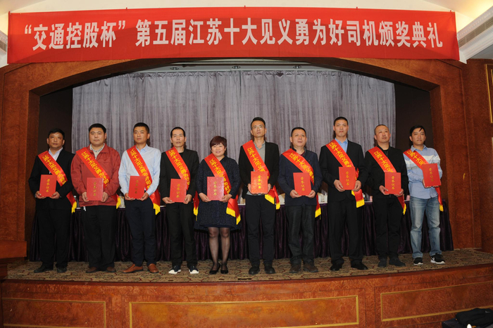 今年起,江苏交通控股有限公司先期资助150万元,冠名“交通控股杯”,开展“江苏十大见义勇为好司机”评选表彰活动。经严格评选,南京市玄武区个体出租车司机杨顺利等10人当选第五届“江苏十大见义勇为好司机”,颁发奖金各1万元。南京市扬子公交502路公交车司机黄久超等20人获提名奖,颁发奖金各5000元。他们当中,有的在危急时刻,凭着一身正气,临危不惧,与犯罪分子作英勇斗争;有的成为社会治安的“千里眼”、“顺风耳”,凭着高度警觉性,提供案件线索,协助警方抓获犯罪嫌疑人;有的在他人遇到危险或发生事故的紧急关头,奋不顾身,挺身而出,救人于危难之中。他们用英勇壮举托起了社会正义,用实际行动展现了人间大爱,用浩然正气践行了社会主义核心价值观,展示了广大见义勇为好司机的精神风采。