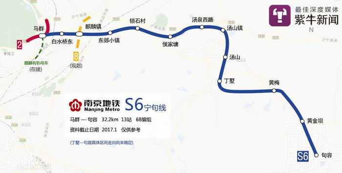 记者查询发现,南京地铁规划中的S6号线,又称宁句线,计划于2023年6月通车,途经栖霞区、江宁区和句容市,线路西起马群站,经麒麟新城、汤山新城,到达句容城区,南至句容站。根据描述,地铁S6号线全长44.07千米;共设置16座车站,其中地下站7座、高架站9座;列车采用6节编组B型列车。