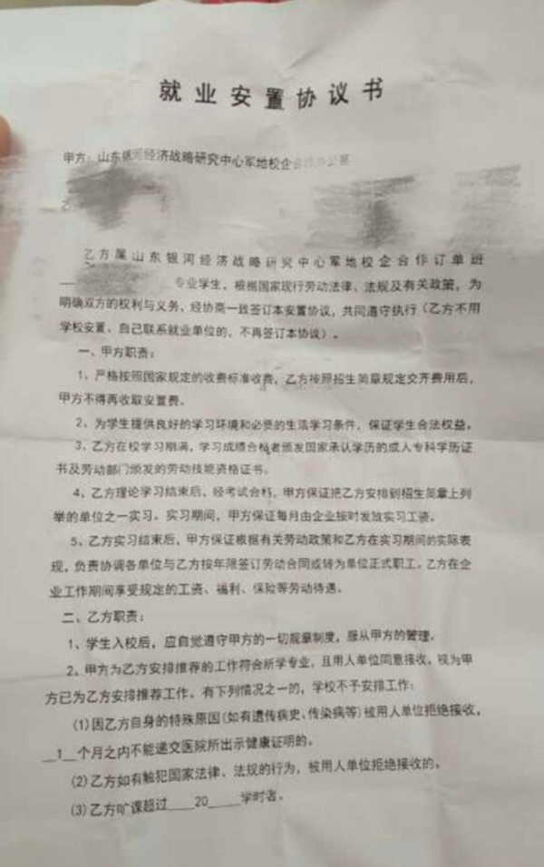 学生与军地教育学院签订的《就业安置协议书》,要求甲方把乙方安排到招生简章列举的单位之一实习。 受访者供图