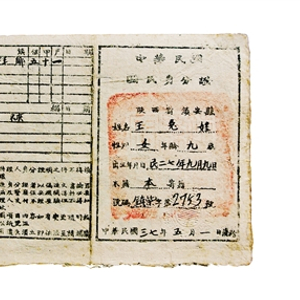 1946年,民国政府公布《户籍法》,规定制发国民身份证,发证对象是18岁以上的国民,不分男女;未满18岁,自动请求者也可准予发给。这张身份证的颁证日期为1948年5月1日,那时太奶奶只有九岁,还在读小学一年级。身份证长16厘米,宽12厘米,共2页,单面对折印制,整体白底黑字。第一页右半部分为封面,第一、二行宋体字印有 “中华民国国民身份证”字样,第三行起依次为“陕西省镇安县、姓名、性别、出生年月日、本籍、寄籍和号码”等项,正中还有红色大方印章(字迹不详),最下一行落款为“中华民国三七年五月一日发给”;第一页左半部分为表格样式,包括“保甲番号、住址、注意事项”,其中保甲番号包括“乡镇、保、甲、户”等编号。第二页左半部分表格分别包括“教育程度、职业、公职候选人资格、特征”等项目,其中特征中除了盖有指印外,还对双手十指上的“箕、斗”纹分别用“×”“○”进行了标记,在照片或标准指纹一栏还有圆形钢印(镇安×× 国民身份证),右半部分表格自上而下依次分别为“公民资格、家属、役历”等项,其中“家属”项目中对其亲属关系包括“父、母,姊”均有详细记载,兼具有现在身份证和户口簿的作用。