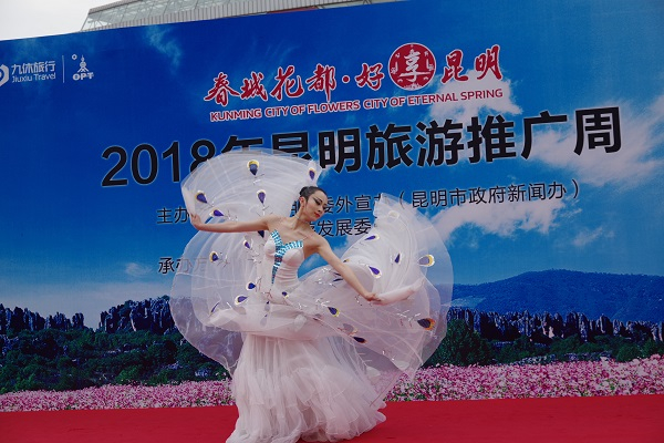 随着《欢迎您到石林来》背景音乐的响起,身着彝族服饰的石林“阿诗玛”、“阿黑哥”跳起民族歌舞,向参观者介绍当地的特色旅游文化。花开昆明,如诗如画,四季花香常相伴。这个时节,游客去石林风景区,可以欣赏具有世界上最奇特的喀斯特岩溶地貌景观,被誉为“上帝的盆景”、 “天下第一奇观”;可以到九乡旅游区,这里有典型的高原喀斯特地质遗迹和地质景观,拥有大小溶洞上百座,溶洞体量宏大;也可以带着孩子到石林冰雪海洋世界游玩,体验大型室内滑雪场、冰雪乐园、海洋公园、亲子主题酒店、室外游乐场等互动娱乐项目;还可以到石林杏林大观园,体验中药养生为主题的综合旅游项目。