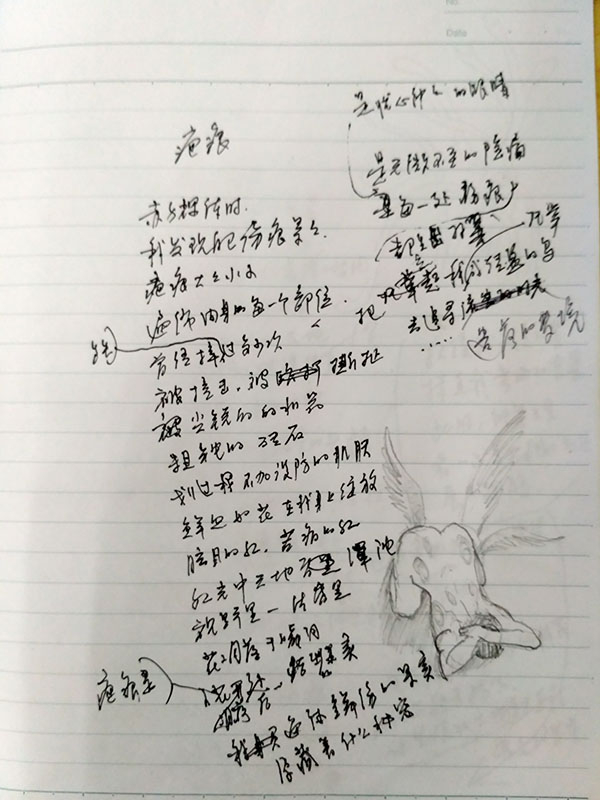 笔记本空白处,布满了赵丽宏对诗作的涂改和涂鸦,“我喜欢一边写诗一边在笔记本上涂鸦。”赵丽宏表示,把这部手稿捐给静安区图书馆是自己早已想好的一个决定,“我在图书馆的书房去年落成的时候,就在这里举办了一次《疼痛》朗诵会。所以我一直想把《疼痛》手稿捐给静安区图书馆。”