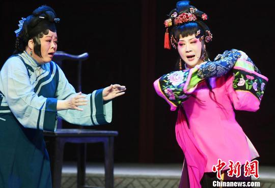 中国戏剧梅花奖获得者陈琼(右)饰演王莲莲,二级演员阮以钦(左)饰演甘国宝。 刘可耕 摄