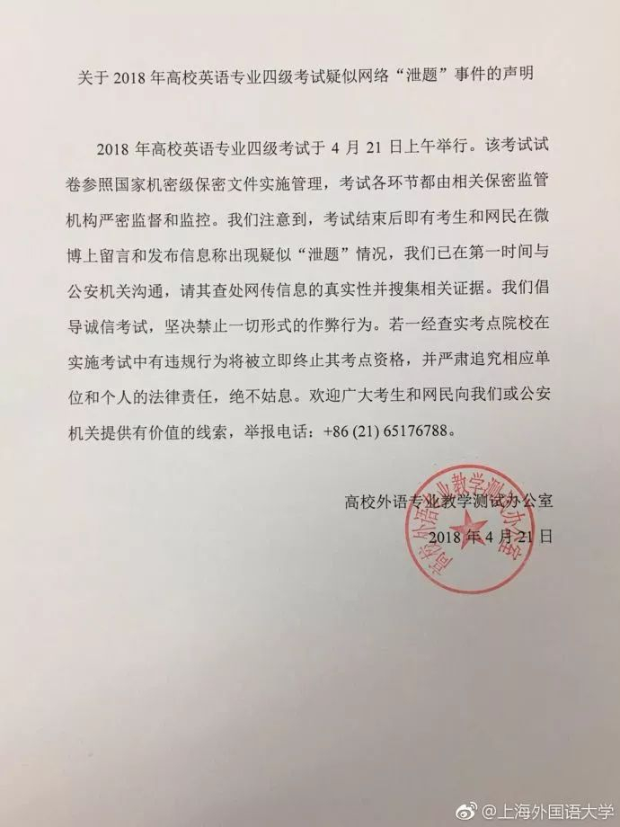 考试的出题方上海外国语大学表示,学校已将掌握的信息及时通报给考试组织方高校外语专业教学测试办公室,高校外语专业教学测试办公室已向公安机关反映情况。