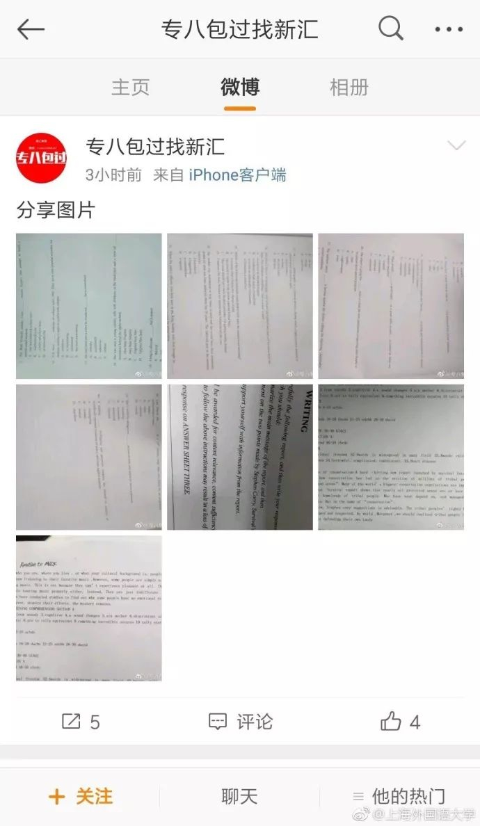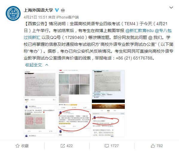 昨天下午3时51分,上海外国语大学官方微博针对此事作出情况说明。情况说明中提到,考试结束后,有考生举报微博用户“新汇教育edu”“专八包过找新汇”以及QQ用户“17293460”等涉嫌泄题。