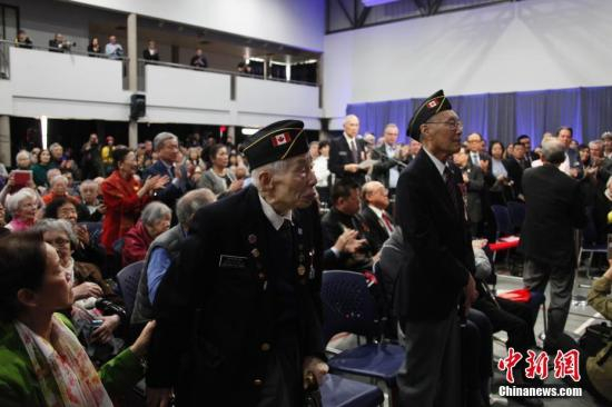华社民众及其他族裔代表等约500人参加这次特别会议。图为95岁的李文英(左)及其他多名百岁上下的华裔退伍老兵亮相现场,全场与会者以热烈掌声致敬。中新社记者 余瑞冬 摄
