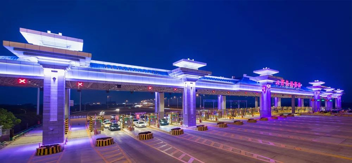 在二通道收费站上,设计时采用了全彩光源,在凸显楚韵风格的建筑特色同时营造多种迎宾气氛。