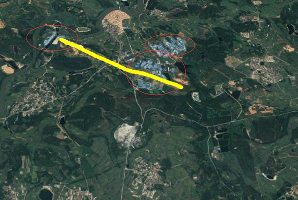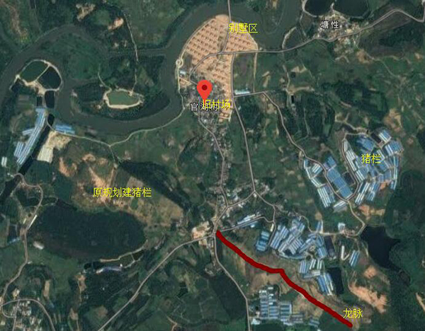 地图上同样可以直观的感受到,原来的林地、植被被蓝色的猪栏所替代,龙脉北侧的位置相对较高的山岭两侧猪栏最多,陈小雷说,建在高处是为了能顺利的排污,猪栏之外,公司还在村里建有配套的污水处理厂和沼气池。