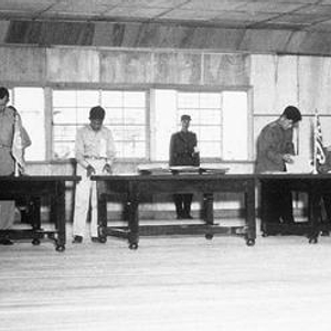 1953年7月27日,《朝鲜停战协定》签署现场,左侧坐者为联合国军代表团首席代表、美国陆军中将威廉·凯·海立胜,右侧坐者为朝鲜人民军与中国人民志愿军代表团首席代表、朝鲜人民军大将南日。