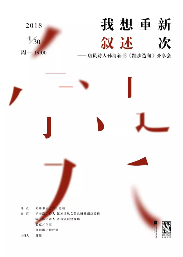 孙清,人称“教授”,现为先锋书店五台山店书区店员。三年漂泊,八年与书相伴,始终如一,而诗歌,他说,那是他的一种本能。于是,从2017年的11月28日起,为了孙清的诗集能够出版,我们发起了为期一个月的众筹。在一个月后,我们本来忐忑的心情却转换为了感动,我们深感诗歌的未来仍然值得期待,也是对我们这样重视诗歌书店的鼓励,更是给店员的心上点亮了一盏灯。4月30日晚,我们将举办店员诗人孙清诗集众筹回馈分享会,特邀您来五台山总店,和众位嘉宾一起谈诗歌,也和“教授”孙清一起聊聊天。