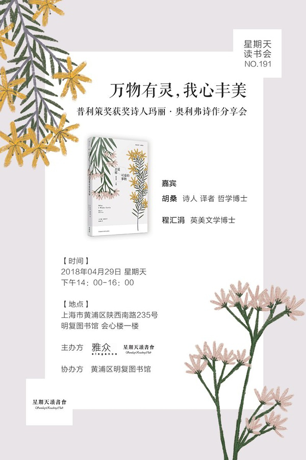 玛丽·奥利弗是美国最高文学奖普利策奖、美国国家图书奖双料获奖诗人,她被《纽约时报》视为“有史以来最畅销的诗人”,却远离喧嚣,避世畏名。她深居山林,与蟋蟀、熊为伴,和飞燕草、鸢尾相邻。她永远保持好奇,潜心诗艺,赞美万物,在纷乱烦杂的时代中,坚持一种孤独而专注的生活。本次活动,我们将邀请两位嘉宾一起分享玛丽·奥利弗的诗歌,现场他们将分别用中文和英文领读、朗诵奥利弗诗歌作品并与现场观众自由交流分享。