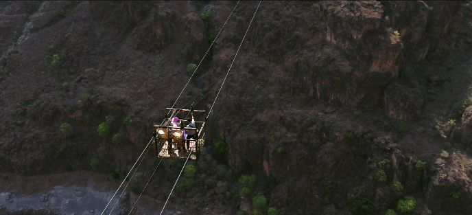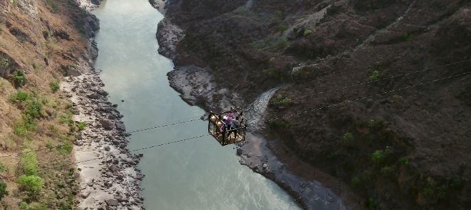 阳光浓烈,溜箱投下的一小团黑影先打在崖壁上,又缓缓移到江面,随后爬上对岸悬崖。江风呼啸,钢缆抖动,溜箱缓缓移向对岸。蒋世学站在鹦哥村的操作房里,凝视着慢慢远去的溜箱。