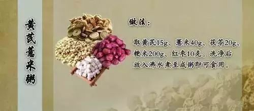 做法:取生黄芪15g、薏米40g、茯苓20g、粳米200g、红枣10克。洗净放入沸水煮至成粥即可食用。
