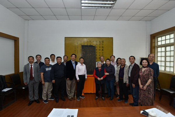 宜宾市副市长王力平(前左五)和徐诵明外孙徐冬冬(前左四)、罗南陔之女罗幼梅(前左六)等来自北京、宜宾、上海、南京、西安等地“匾中人”后人及专家学者在“同济大学李庄徐祝罗匾”前合影。 宜宾博物院 提供