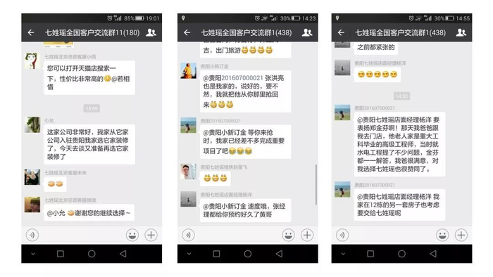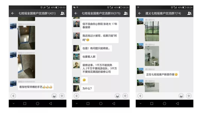 2015年初,蒲孟在全国较早提出“先围观 后装修”理念,他安排专人建了第一个微信群,叫做“七姓瑶全国客户交流群”要求全国各分公司将所有完工了的客户,装修中的客户,意向装修客户全部拉到同一个微信群,由于七姓瑶早已实行直聘工人模式,没有转包这个致命问题,因此很快就推行开了。