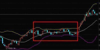 上图中的方框内的横盘整理的形态,K线数次触及布林线的上、下轨。这种在震荡市当中的策略就是高抛低吸。而且要谨防的是一旦出现破位下行,则要割肉离场,相反对应的是一旦发现踏空,要果断买回。