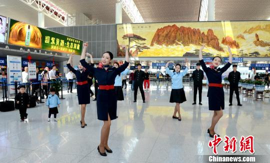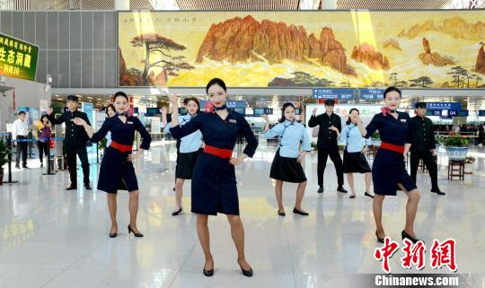 当日中午,合肥新桥国际机场候机楼东航柜台前,音乐突然响起,一群身着中山装的十几位男女青年齐刷刷出现在候机楼大厅,并随着音乐的节拍跳起了律动的舞蹈,顿时吸引了大量游客驻足观赏、拍照。舞蹈结束,东航安徽分公司的乘务员和地服人员还开展了志愿服务,协助旅客办理值机,提供乘机讲解服务。