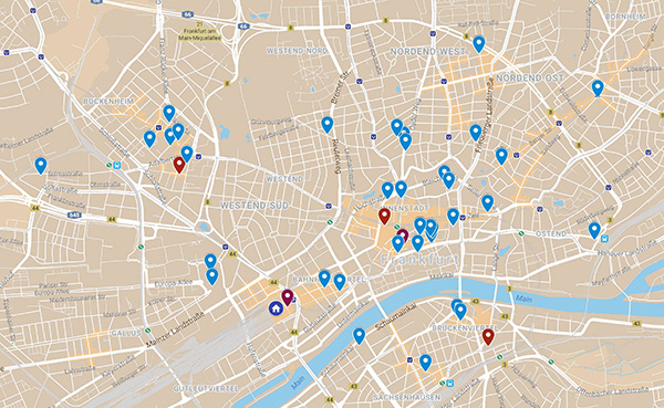 法兰克福书店分布概况,由笔者参照谷歌资料制成(部份书店因为受限于笔者能力有些信息无法取得、无法确认营运情,故没有出标记在上面)。酒红色标记为本文介绍到的五间书店,房屋标志是作为参照点的法兰克福总火车站。