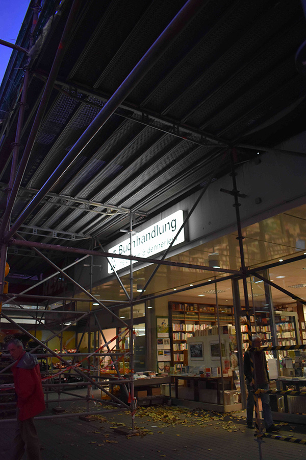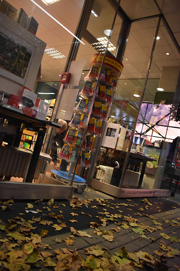 到达Meichsner & Dennerlein时,已经是傍晚,老板正在收店,他看起来就像是那种可以一辈子专注在书籍的店主。店前的落叶与装修的支架,在黄昏近晚的黯光照射下显得很有味道。店面不大,但书的数量、种类却是很多,偶可见到些小礼品,但绝对会让人意识到是间以书为主的书店,并且有着浓厚的人情味。