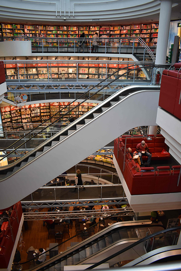 整间店的设计很有质感,但特别的是,我觉得这间店的设计没有太多关于文艺气氛的”刻意”,而是刚刚好介于实际和质感之间,或者Hugendubel本来就不打算走文艺风格。近年来我常觉得两岸的一些书店的装潢,都怀抱着对某种对西方经典书房风格的想象,比如常可以联想到厚厚的精装书,木纹实木家具,这样的“文艺风格”在近年来的设计其实横跨各类店家(甚至我在南京的某火锅店都看过这种装潢风格,装潢书架与都是精装纸壳的空书)。这类的风格也不是不好,毕竟连我自己经营的书店也有点这种倾向,用个比喻来说,有点像是在吃了好多年以重调味的为主料理之后,忽然吃到以食物本来味道为主的料理。店面空间的运用也相当实际,某程度上可以让人想到对德国“不浪漫”这件事的刻板印象。